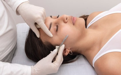 This is the most common type, where a sterile surgical blade is gently moved across the skin’s surface to remove dead skin cells and fine facial hair. It helps make the skin smooth, soft, and bright. It’s suitable for all skin types and gives an instant glow.